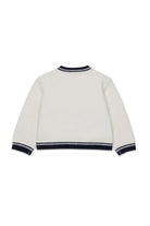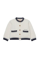 Long-sleeved wool-blend knit cardigan embellished with front pockets and contrasting details on the crew-neck, cuffs and bottom, enhancing the design. A refined and versatile garment.