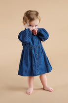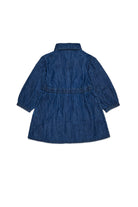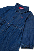 Long-sleeved mid-blue denim short dress. The lightweight fabric ensures comfort and freedom of movement, while the drawstring waist allows you to adjust the fit.