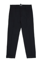 Formal chino pants in cool wool. American-style front pockets. Metallic logo plaque above one of the back pockets. A perfect garment for ceremonies and special occasions.