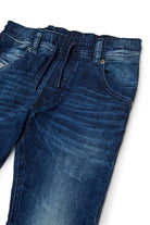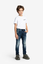 Krooley regular-fit jeans in dark blue denim with breaks and sporty attitude. A straight-cut design with a tapered leg that is looser on the thigh and gradually tapers toward the ankle. A worn-looking jeans that adds a touch of personality to any outfit.