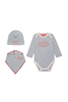 Stretch jersey birth set with matching bodysuit, cap and bib. The kit comes inside an original gift-box.