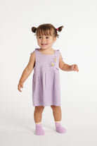 Short dress with logo and floral embroidery on the front. The straps are tied and the skirt features a slight gathering.