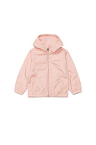 Windbreaker with printed logo, fixed hood, and clean lines.