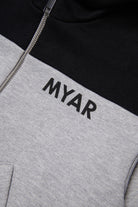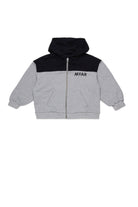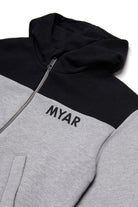Full zip hooded sweatshirt, contrasting details on shoulders and hood, 100% cotton.