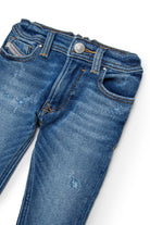JoggJeans® D-Slinkie-B skinny fit in medium blue denim with abrasions. A very snug yet comfortable fit that follows the body's physicality by comfortably wrapping the leg like a second leather. A must-have jeans in every boy's wardrobe.