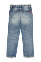 Five-pockets jeans with a straight fit and timeless attitude. Medium waist. Made of denim in a hybrid shade of blue and grey. Distinguished by gradients, whiskers and color contrasting seams. Mending abrasions and frayed hems on front pockets and hem. Features a contrasting color embroidered "D" logo on the back pocket. The design features an adjustable waist and elastic closure.