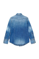 Denim shirt with applied logo on the chest, featuring double front flap pockets and snap buttons.
