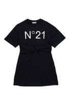 Short dress with printed logo and knotted waist detail, featuring a casual and contemporary design.