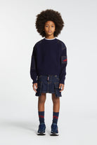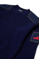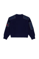 Crew-neck crew-neck pullover in rib-knit wool blend with denim inserts. A patch with logo from Icon New Generation embroidered in contrasting color stands out on the sleeves. Perfect for creating casual original looks.