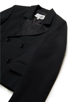 Long-sleeved blazer jacket in cool wool. Shiny satin lapels. Front features a tone-on-tone embroidered institutional logo. Raw edge details on the bottom. Front flap pockets. Double-breasted closure. Iconic seam at back. Viscose inner lining. A special garment, ideal for parties and ceremonies.