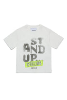 Crew-neck T shirt made with deadstock fabric and rib on the neck. Silk-screen print of the Stand up graphics on the front.