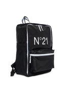 Backpack with main compartment and outer pocket with zip. Features logoed tape details. N°21 Institutional logo in contrasting color. Padded shoulder straps on the back. Sleeves on top. 100% cotton inner lining. Measurements: 40 cm high, 28 cm wide, 16 cm deep (without pocket).