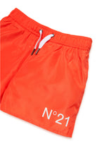 Nylon boxer swimsuit. Midi length. Drawstring waist. Contrasting color N°21 Institutional logo on front. Mesh inner briefs. Back pocket.