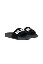 Modern design slide slippers. Terrycloth upper with maxi Marni! logo embroidered in contrasting colour. Polyurethane sole. Made in Italy.