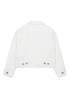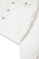 Denim jacket with printed logo and iconic stitching on the back. Design features metal buttons and patch pockets on the chest.