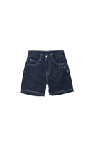 Denim shorts with an embroidered logo on the front and a logo patch on the back. The piece stands out for its contrast stitching and five-pocket design.