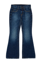 Dark blue denim bootcut jeans enhanced with contrasting seams and gradients. The flared cut flatters the silhouette, making them perfect for an everyday look with a sophisticated touch.
