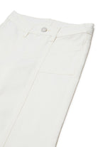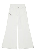 Flare fit jeans in white denim with exposed stitching and back patch.