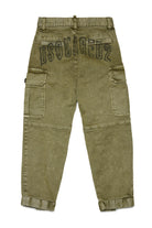 Vintage-effect stretch gabardine cargo pants. A garment with a strong character, with spots of color and the deliberately ruined Dsquared2 logo, perfect for standing out.