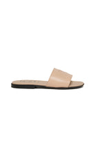 Slide sandals with perforated logo on the front strap.