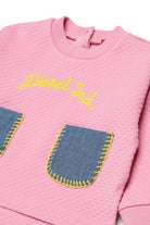 Sudadera de cuello redondo con logo y bolsillos aplicados en denim de contraste, perfecta para añadir un toque original al armario diario.