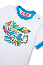 Camiseta con logo y estampado multicolor en la parte delantera, detalles a contraste en el cuello y el bajo de la manga.
