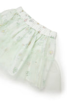Falda corta de tul con motivo floral y detalles fruncidos para un efecto vaporoso.