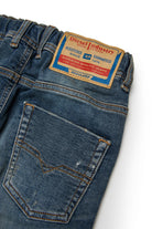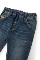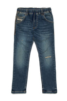 JoggJeans® Krooley regular fit en denim azul oscuro con roturas y actitud deportiva. Un corte recto con una pierna cónica que es más suave en el muslo y se estrecha gradualmente hacia el tobillo. Un vaquero de aspecto vintage con zurcidos en zigzag típicos del ADN Diesel.