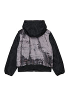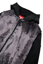 Chaqueta confeccionada con una mezcla de materiales que expresa el estilo Diesel en su máxima expresión. La capucha y las mangas en tejido brillante crean un contraste con la suavidad del peluche caracterizado por un original efecto tie-dye. Perfecta para afrontar el invierno con personalidad.