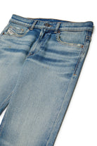 Jeans regular fit en denim azul claro con efecto lavado y detalles desgastados.