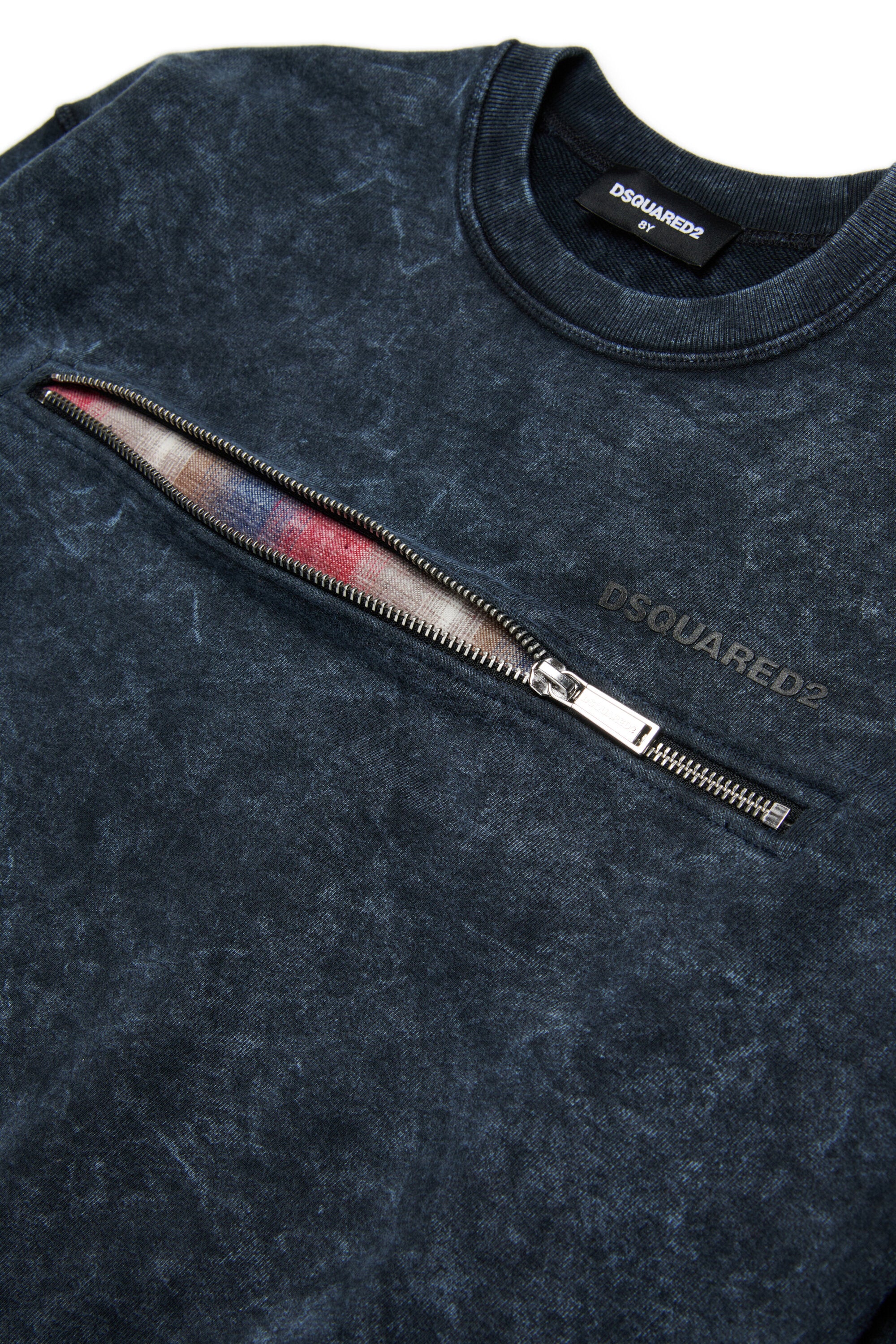 Sudadera de cuello redondo de manga larga con efecto jaspeado. El bolsillo delantero con interior de franela a cuadros añade un toque de estilo, entre estética grunge y funcionalidad.