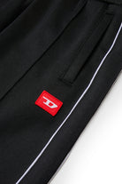 Pantalones globo de triacetato brillante con parche D rojo y ribetes en contraste, una fusión de confort e inspiración deportiva. El corte suave y estructurado se realza con el canalé delantero.