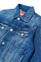Chaqueta vaquera con logo y lavado azul medio. El modelo presenta costuras en contraste, bolsillos aplicados en el pecho y botones metálicos.