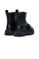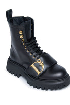 Botines con cordones, empeine y forro de piel de becerro y suela gruesa de goma. Llevan un logotipo D2 metálico aplicado a la correa presente en la parte superior.
