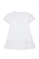Vestido con logo bordado y detalles en contraste. El modelo presenta mangas cortas y bajo con volante. La confección se distingue por el tejido mixto de algodón y lino, ideal para un look fresco.