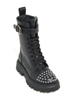 Botas anfibias de piel con tachuelas decorativas en la puntera y una correa con hebilla en la parte superior de la caña de la bota. Un modelo perfecto para añadir un marcado toque rockero a cualquier look.
