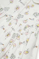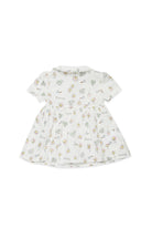 Vestido corto con logotipo allover y estampado floral, caracterizado por cuello redondeado y mangas cortas.