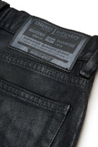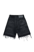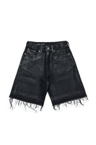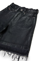 Pantalones cortos de denim negro con dobladillos de corte crudo. El revestimiento especial le confiere un particular efecto brillante que realza el alma grunge de la prenda.