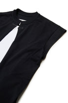 Vestido midi de manga corta y cuello redondo confeccionado en jersey de algodón. Confección en forma de A que simula el ensamblaje de dos prendas previamente desestructuradas. Detalles de corte en crudo. Costura icónica en la espalda. Una prenda que encarna el ADN de MM6.