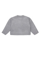 Sudadera de cuello redondo de doble capa azul y gris en neopreno, con bolsillo en el pecho en contraste y botón a presión metálico.