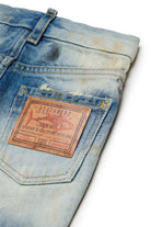 Vaqueros regulares efecto denim azul claro con detalles desgastados y lavado usado.