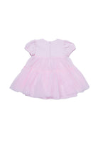Vestido de cuello redondo con mangas globo. Lleva un logo institucional bordado en contraste de color en la parte delantera, en el lado del corazón. Parte inferior de tul con enaguas de algodón. Cierre de cremallera en la parte trasera. Perfecto para ceremonias y ocasiones especiales.