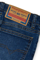 Jeans slim fit en denim azul medio con costuras en contraste.