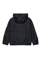 Chaqueta cortavientos con logo estampado en el pecho y detalles en contraste. El modelo presenta capucha fija y cierre frontal con cremallera.
