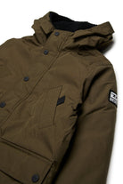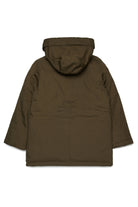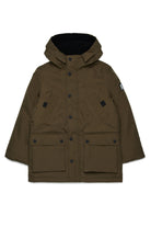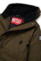 Chaqueta acolchada largo de nailon con parche de Diesel en el hombro. Relleno de falso plumón con capucha. Cierre de cremallera frontal oculta, cuatro bolsillos en la parte delantera.