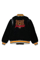 Chaqueta bomber de peluche con parche de oso bordado en la espalda. Un guiño irónico al mundo del terror y referencias a los salvajes bosques canadienses, un detalle que no pasará desapercibido.