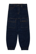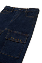 Vaqueros cargo en denim oscuro efecto jaspeado con bolsillos a lo largo de la pernera. Un modelo que combina practicidad y estilo con costuras en color tabaco que realzan el diseño. Una prenda de aspecto limpio y fácil de combinar.