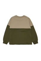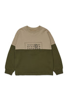 Sudadera bicolor de cuello redondo y manga larga con una construcción recortada típica de MM6. El diseño simula el ensamblaje de dos prendas deconstruidas y vueltas a montar, creando un look atrevido y contemporáneo, acentuado por el dobladillo de corte crudo.