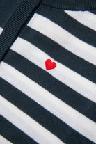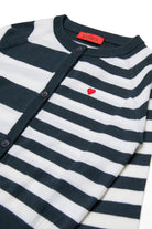 Cárdigan de manga larga en suave punto de mezcla de lana, caracterizado por rayas de diferentes alturas que confieren originalidad a la prenda. Un pequeño corazón rojo bordado en el pecho añade un toque romántico y distintivo.