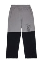 Pantalones de felpa bicolor con construcción de corte recortado típica de MM6. El diseño simula el ensamblaje de dos prendas deconstruidas y vueltas a montar, con el bajo de corte crudo que crea un aspecto original y moderno.